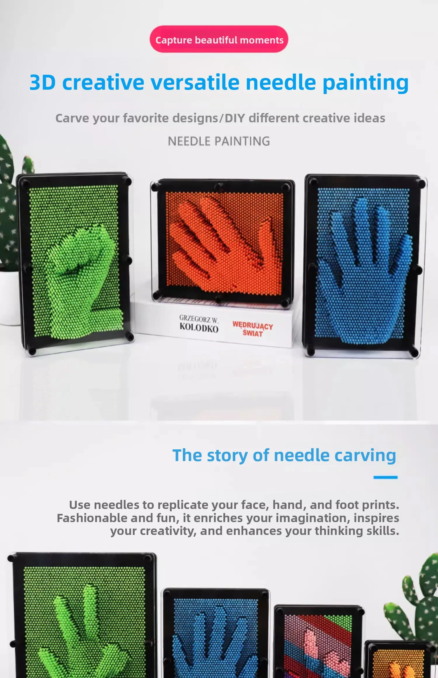 - Press a hand, toy or object gently into the pins to create a 3D impression.
