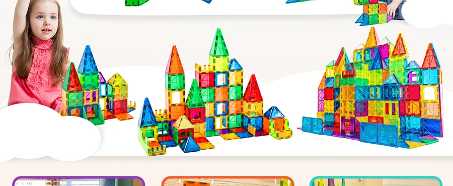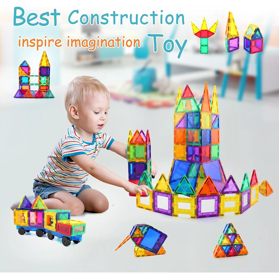 Children connect the tiles via built-in magnets to create 2D patterns and 3D structures, which may assist with fine motor skills, problem-solving, and independent play across different stages of childhood.